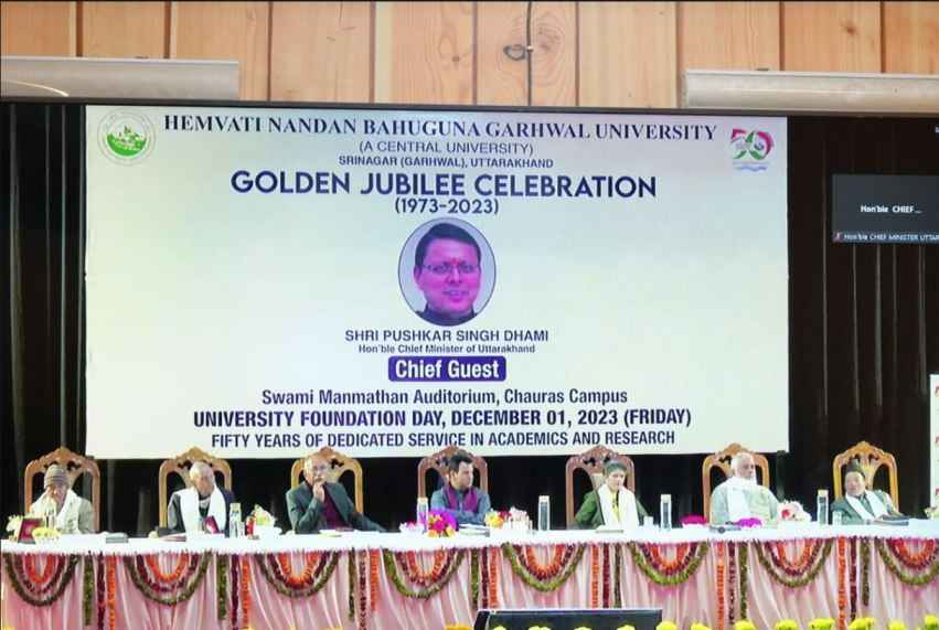 मुख्यमंत्री पुष्कर सिंह धामी ने हेमवती नंदन बहुगुणा गढ़वाल विश्व विद्यालय, श्रीनगर के स्थापना दिवस और स्वर्ण जयंती कार्यक्रम में वर्चुअल प्रतिभाग करते हुए विश्वविद्यालय के स्वर्ण जयंती समारोह की सभी को शुभाकामना दी। उन्होंने हिमालय पुत्र स्वर्गीय हेमवती नन्दन बहुगुणा का स्मरण करते हुए कहा कि यह विश्वविद्यालय उनकी विकासवादी सोच का परिणाम है। विश्वविद्यालय पिछले पांच दशकों से स्व. श्री बहुगुणा जी के विकास के सपने को साकार करने हेतु प्रयासरत है। उन्होंने कहा कि पचास वर्षों से विश्वविद्यालय अपने दायित्वों का बखूबी निर्वहन कर रहा है, इसी का परिणाम है कि 2009 में इसे केंद्रीय विश्वविद्यालय के रूप में मान्यता मिली।